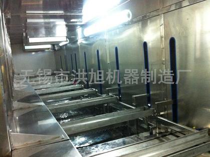 完成清洗各工序后,工件進(jìn)入吹掃工位,同樣為套動(dòng)力輥臺(tái),料框在此轉(zhuǎn)入后半段的滾子鏈輸送機(jī),完成干燥、冷卻和下料工作。
